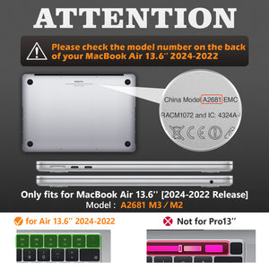 - |Compatibility| Exclusively designed Case for MacBook Air 13.6 inch (new 2025/2024/2022 Release) Model: A3240/A3113/A2681 M4/M3/M2 Chip with Liquid Retina display/Touch ID. Will NOT fit for MacBook Air13/ Pro13. Please confirm your model number "Axxxx"on the back of MacBook before purchase