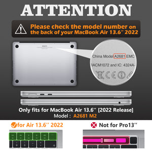 - |Compatibility| Exclusively designed Case for MacBook Air 13.6 inch (new 2025/2024/2022 Release) Model: A3240/A3113/A2681 M4/M3/M2 Chip with Liquid Retina display/Touch ID. Will NOT fit for MacBook Air13/ Pro13. Please confirm your model number "Axxxx"on the back of MacBook before purchase