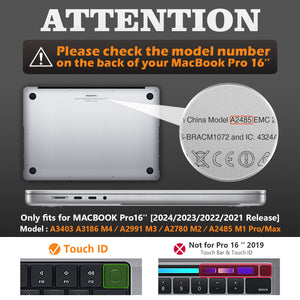 - Compatibility: Exclusively designed Case for MacBook Pro 16 inch (2024/2023/2022/2021 Release), Model: [A3403 A3186 M4/ A2991 M3/ A2780 M2/ A2485 M1 pro/ max Chip]. Will NOT fit for MacBook Pro16-2019/Pro14/Pro13. Please kindly confirm the model before purchase.
